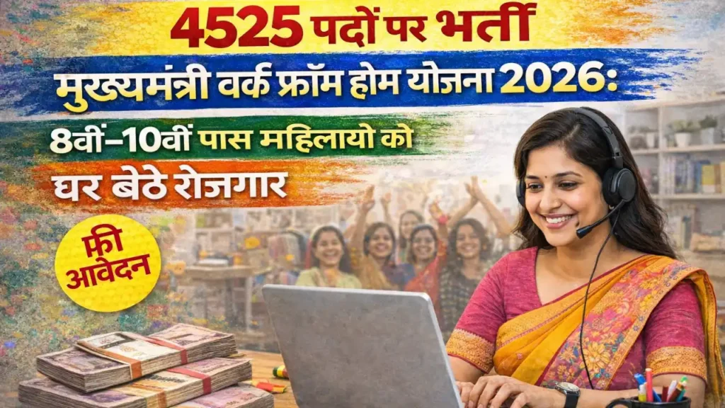 Mukhymantri Work From Home Yojana 2026 को लेकर महिलाओं के लिए बड़ी खबर सामने आ रही है। बताया जा रहा है कि इस योजना के तहत 8वीं और 10वीं पास महिलाओं को घर बैठे रोजगार का अवसर दिया जाएगा। राज्य स्तर पर 4525 पदों पर भर्ती की प्रक्रिया शुरू होने की चर्चा है, जिससे हजारों महिलाओं को आर्थिक रूप से आत्मनिर्भर बनने का मौका मिल सकता है। योजना का मुख्य उद्देश्य उन महिलाओं को रोजगार से जोड़ना है जो पारिवारिक या सामाजिक कारणों से बाहर जाकर काम नहीं कर पातीं।